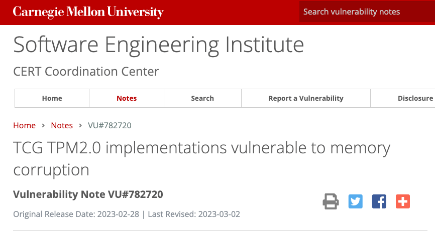 2023/03/03 SecurityAffairs — Trusted Platform Module (TPM) 2.0 の実装に影響を及ぼし、情報漏洩や権限昇格につながる恐れのある2つの脆弱性が発見されたと、Trusted Computing Group (TCG) は警告している。Trusted Platform Module (TPM) は、ハードウェア・ベースのソリューションであり、最新のコンピュータ OS に安全な暗号機能を提供し、改ざんに対する耐性を強化するためのものだ。TPM のコマンド・インターフェースにアクセスできる攻撃者は、悪意のコマンドをモジュールに送信することで、これらの脆弱性を悪用できるようになるという。