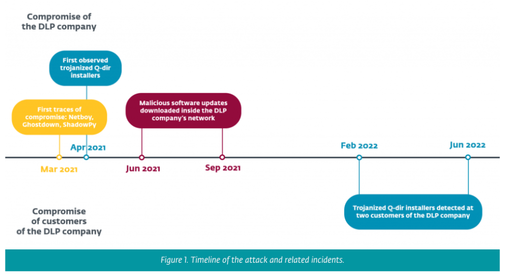しかし、今回の DLP 企業への攻撃は、2021年3月に ESET により発見されたものだ。この3月にハッカーはマルウェアを展開し、その数週間後に Q-Dir インストーラをトロイの木馬化したことになる。