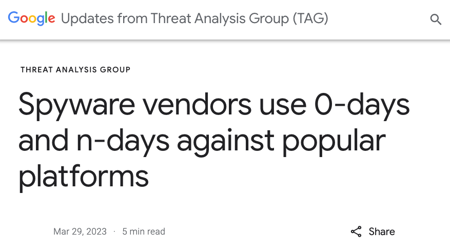 昨日 (2023/03/28) の「米大統領令によるスパイウェア制限:政府による使用については曖昧さが残る」という記事には、今日の記事にあるような商用スパイウェア・ベンダーに対する規制を進めようとする動きと、米政府内での利用という現実の、ギャップが描かれていました。その背景には、今日の記事で Google TAG が明らかにしたような、悪質なキャンペーンと商用スパイウェア・ベンダーの関連性があるようです。こうしたキャンペーンで、いつまでも狙われる脆弱性への対応は不可欠ですね。