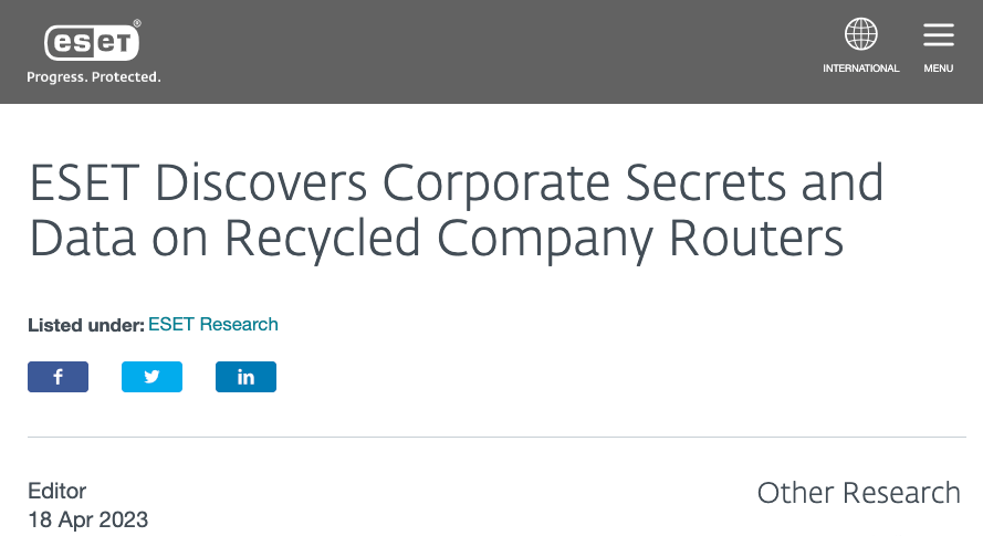2023/04/19 HelpNetSecurity — ESET の調査により、廃棄され二次市場で販売されたルーターの設定データの 56% に、企業の機密データが含まれていることが判明した。この調査のリーダーである ESET のセキュリティ研究者である Cameron Camp は、「今回の調査結果がもたらす潜在的な影響は、極めて懸念すべきものであり、警鐘を鳴らすべきものだ」と述べている。