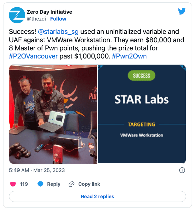 2023/04/25 BleepingComputer — VMware は、2つのゼロデイ脆弱性に対処するための、セキュリティ・アップデートをリリースした。それらの脆弱性の連鎖に成功した攻撃者に対して、VMware Workstation/Fusion ソフトウェア・ハイパーバイザー上で、コード実行を許す可能性がある。この2つの脆弱性は、1ヶ月前に開催された Pwn2Own Vancouver 2023 ハッキング・コンテスト Day-2 で、STAR Labs チームのセキュリティ研究者たちが、デモを行ったエクスプロイト・チェーンの一部である。