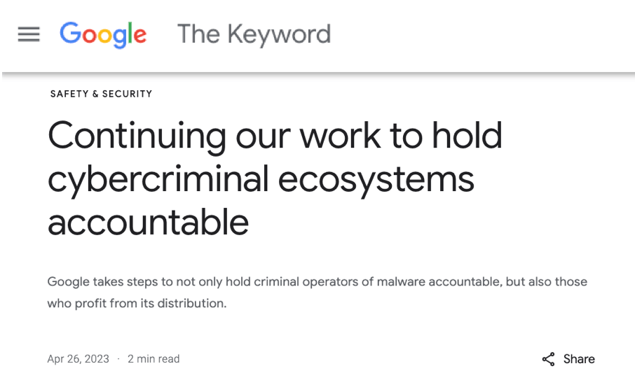 2023/04/27 TheHackerNews — 4月26日 (水) に Google は、CryptBot と呼ばれる Windows ベースの情報窃取型マルウェアの配信を阻止し、その増殖を減速させるために、米国の裁判所から仮の命令を取得したことを発表した。この取り組みは、マルウェアの犯罪オペレーターだけでなく、その配布により利益を得る者に対して責任を追求する措置でもあると、Google の Mike Trinh と Pierre-Marc Bureau は述べている。