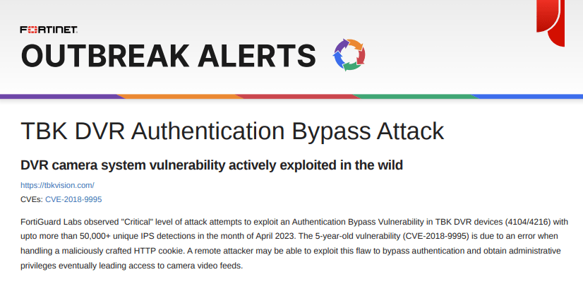 Fortinet のアラートは、「数万台の TBK DVR が、さまざまなブランドで販売されており、PoC エクスプロイト・コードも公開されているため、この脆弱性は攻撃者にとって格好の標的となっている。最近になって、IPS による検出数が急増したことは、このネットワーク・カメラ機器が、依然として攻撃者の人気ターゲットであることを示している」と指摘している。