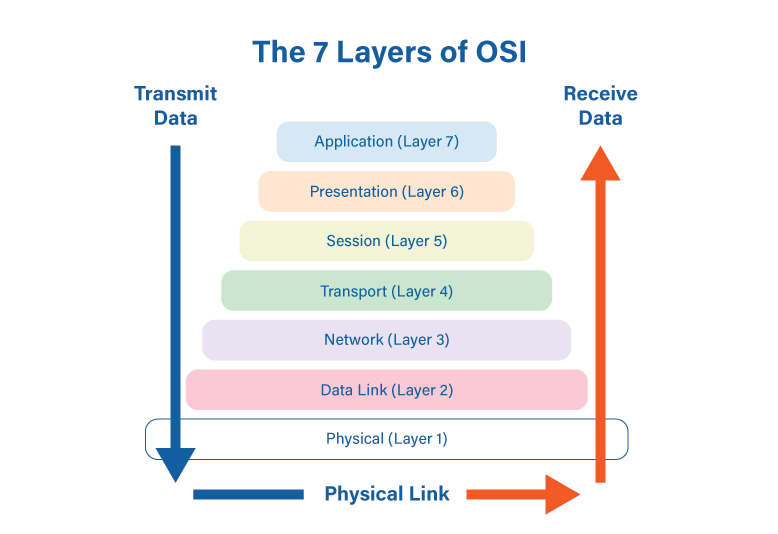 この層は、ケーブル/ワイヤ/無線信号などの物理媒体上での、生のビット・ストリーム (2進数の1と0) の送受信を担当し、物理的な接続の確立/維持/解除を行う。データビットを同期させ、データ伝送速度や、全二重/半二重モードなどの、データ伝送モードを定義する。物理層で使用されるデバイスは、イーサネット・ケーブル/同軸ケーブル/光ファイバーなどのコネクターである。