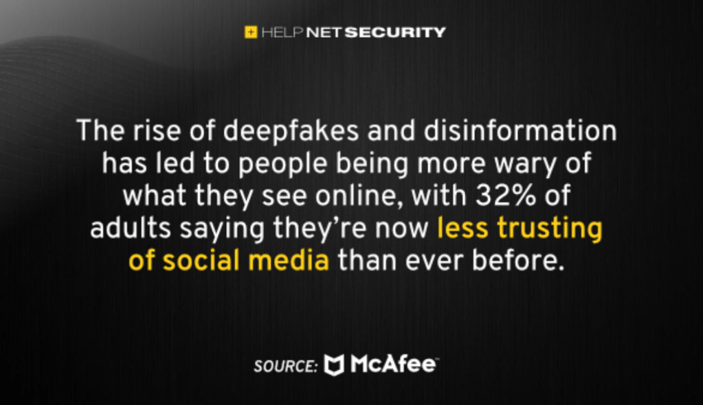 また、本調査では、ディープ・フェイクや偽情報の増加により、人々がオンラインで目にするものに対して、より警戒心を持つようになったことも明らかにされている。成人の 32% は、ソーシャル・メディアに対する信頼度が、以前よりも下がったと答えている。