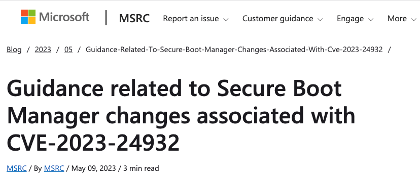 - 2023年5月9日: CVE-2023-24932 に対するイニシャル・フィックスがリリースされる。このリリースでの修正は、2023年5月9日の Windows セキュリティ・アップデートと、保護を完全に実装するためのユーザーのアクションを必要とする。