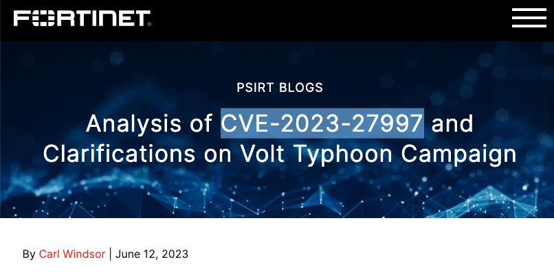 先日に公表された、米国内の重要インフラ組織を標的とする Volt Typhoon 攻撃との関連について、Fortinet は明らかにしていない。しかし、この中国のサイバー・スパイ・グループが、脆弱性 CVE-2023-27997 を標的にする可能性について言及した。