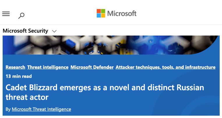 Microsoft は、「ウクライナのコンピュータの Master Boot Record (MBR) を消去する、WhisperGate ワイパーマル・ウェアを作成したのが Cadet Blizzard だ。特にウクライナでの軍事行動を支援ために、破壊的サイバー操作を行ってきた、GRU に帰属する新しいアクターの出現は、ロシアにおけるサイバー脅威の状況において、注目すべき進展である」と述べている。