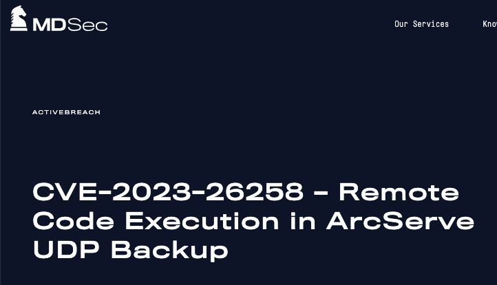 2023/06/29 HelpNetSecurity — Arcserve Unified Data Protection (UDP) エンタープライズ・データ保護ソリューションの認証バイパスの脆弱性 (CVE-2023-26258) を悪用して、管理者アカウントを侵害し、脆弱なインスタンスを乗っ取ることが可能である。この問題を発見した、MDSec の研究者である Juan Manuel Fernández と Sean Doherty は PoC エクスプロイトも公開している。