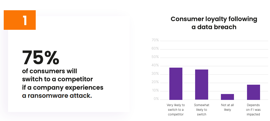 75% の消費者は、企業がランサムウェア攻撃を受けた場合のために、競合他社への移行の準備ができているという。さらに、2回目のランサムウェア攻撃を受けた消費者の 61%は 、データ保護とリカバリ慣行に対する否定の認識を再評価するという。