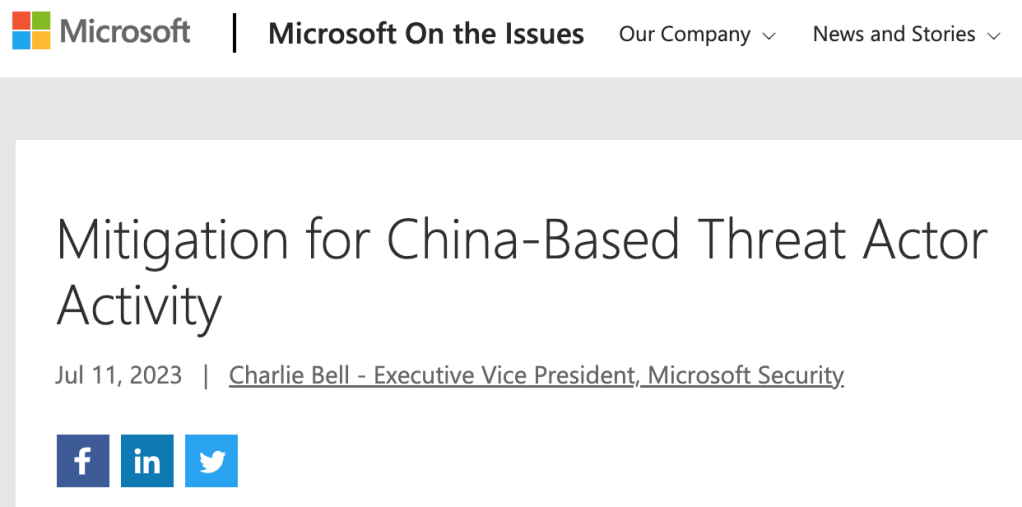 Microsoft が Storm-0558 として追跡している中国由来の脅威アクターが、トークン検証の問題を悪用して、Azure AD ユーザーになりすまし、企業メールにアクセスしたとのことです。以下の関連の記事および、Azure AD で検索も、ご利用ください。
