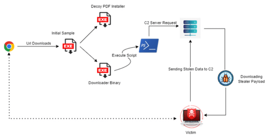 第一段階のペイロードは、おとり PDF インストーラをドロップして実行する一方で、ダウンローダー・バイナリを密かに展開し、PowerShell スクリプトを介してリモートサーバからスティーラー・マルウェアを取得する。