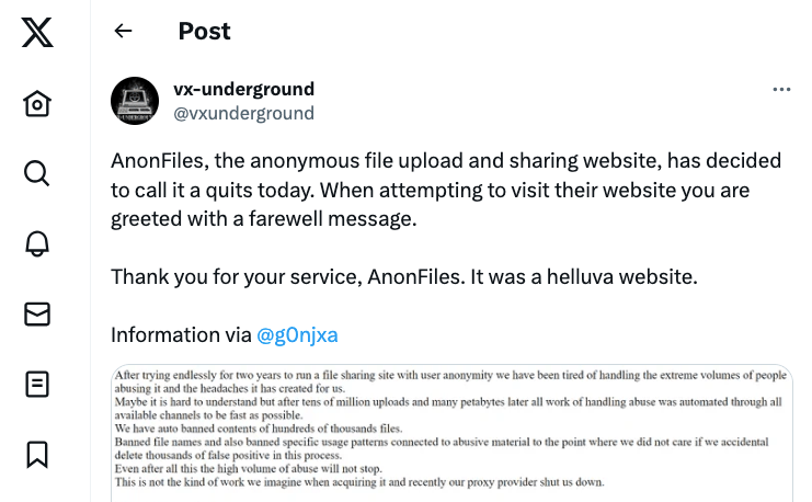もちろん、AnonFiles のユーザーは脅威アクターだけでなく、セキュリティ・コミュニティでも広く支持されていた。マルウェアのソースコード/サンプル/論文のコレクションなどを提供する、インターネット上で最大のサイトである VX-Underground は、Twitter に「AnonFiles に感謝している。本当に素晴らしいサイトだった」と投稿している。