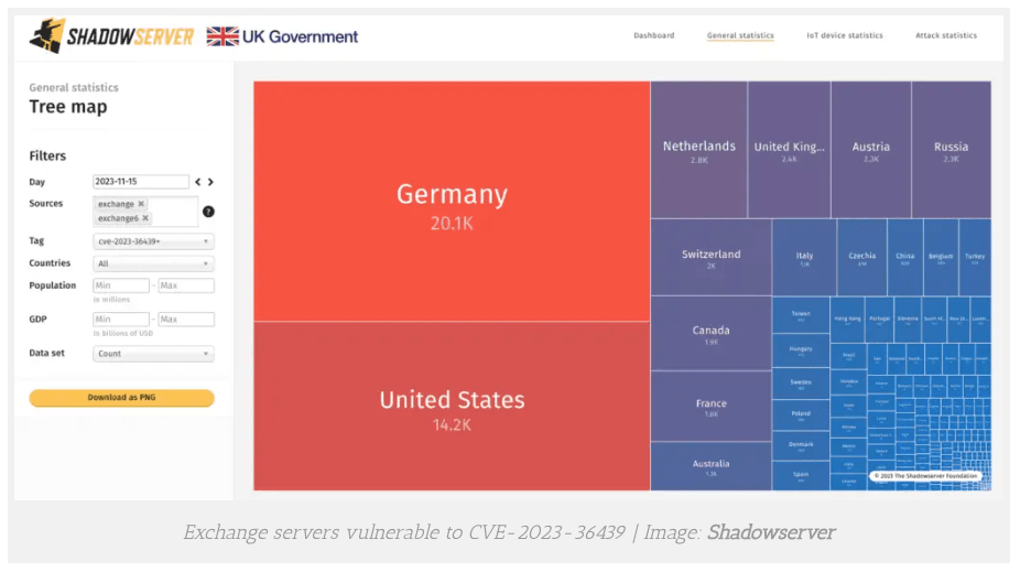 非営利団体 Shadowserver Foundation によると、それらのインターネット上のサーバは、脆弱性 CVE-2023-36439 (CVSS:8.0) の影響を受けやすいという。この脆弱性は、サーバの x_owa_version ヘッダーから特定されされるものであり、Exchange Server 2016/2019に影響を及ぼす。