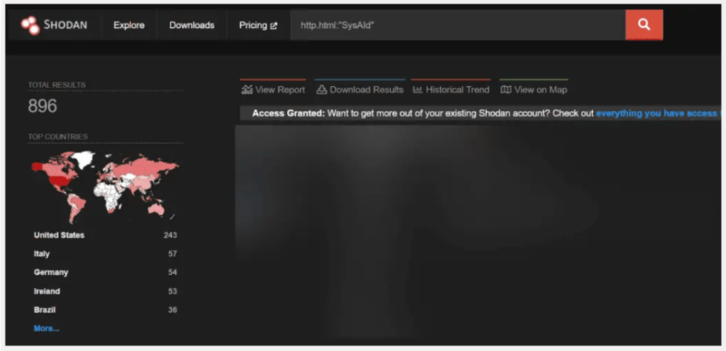 Shodan のクエリーでは、230以上のインスタンスが公開されている状況が分かる。より広範なクエリーでは、900弱のインスタンスの公開が証明されている。つまり、SysAid サーバは、インターネットに深く浸透していることになる。