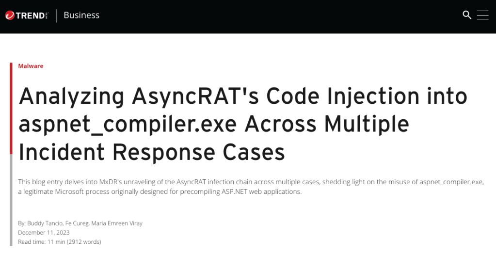 Trend Micro の Managed XDR (MxDR) チームは、AsyncRAT の謎めいた性質を詳細に調査し、Microsoft の正規プロセスである aspnet_compiler.exe を、悪意の目的のために巧みに操作するツールであることを明らかにした。