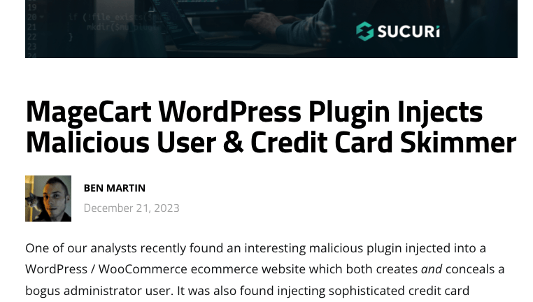 2023/12/22 TheHackerNews — 不正な WordPress プラグインを使用して偽の管理者アカウントを作成し、悪意の JavaScript コードを注入して、クレジットカード情報を窃取するキャンペーンが発見された。このスキミング行為は、eコマース・サイトを標的とした Magecart キャンペーンの一環である。Sucuri のセキュリティ研究者である Ben Martin は、「このプラグインには、他の多くの悪意の WordPress プラグインと同様に、ファイルの先頭に正規のものを装うための、いくつかの偽情報が含まれている。今回の場合は、このプラグインが “WordPress Cache Addons” であると主張するコメントが含まれていた」と述べている。