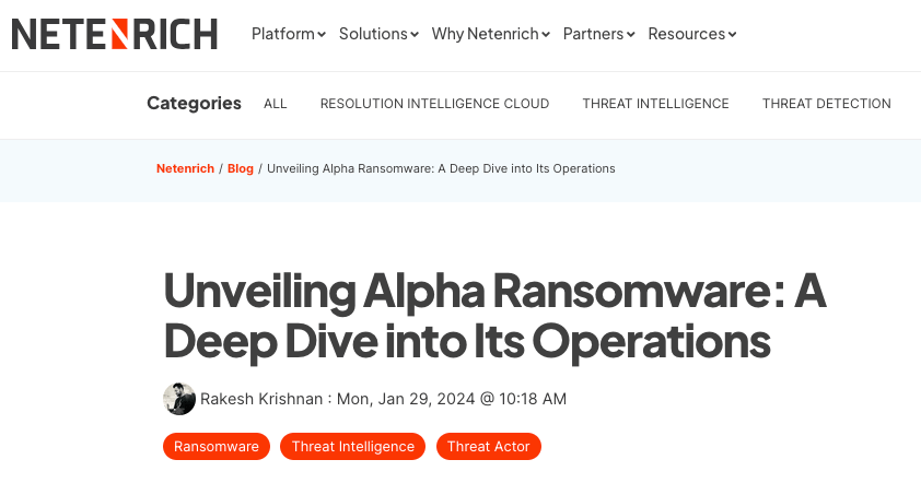 2024/01/30 InfoSecurity — 最近のことだが、Alpha と呼ばれる新たなランサム・ウェアグループが出現し、ダークウェブ上に Dedicated/Data Leak Site (DLS) を立ち上げ、6件の被害者たちのデータの初期リストを掲載している。ただし、2023年5月から観測されている Alpha ランサムウェア (ALPHVとは別物) は、競合するギャングたちと比べて感染率が低く、分析に利用できるアクティブなサンプルも野放し状態になっていない。