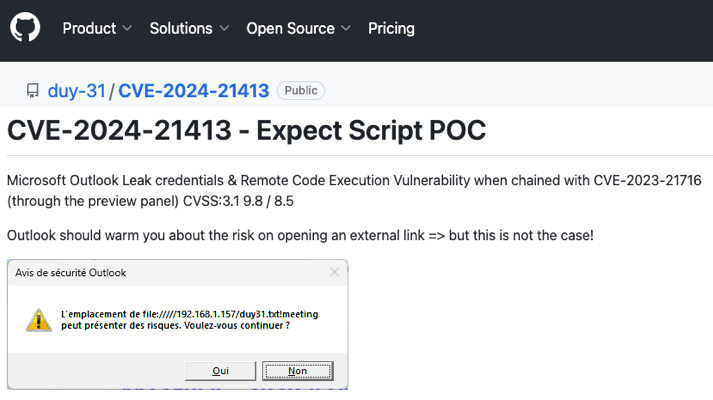 この脆弱性 CVE-2024-21413 に対しては、先週に Microsoft がパッチを発表し、Check Point がテクニカル・レポートを公開している。しかし、それから数日も経たないうちに、この重大な問題を標的とする PoC コードが GitHub で公開され、脅威アクターたちへの道が開かれた。
