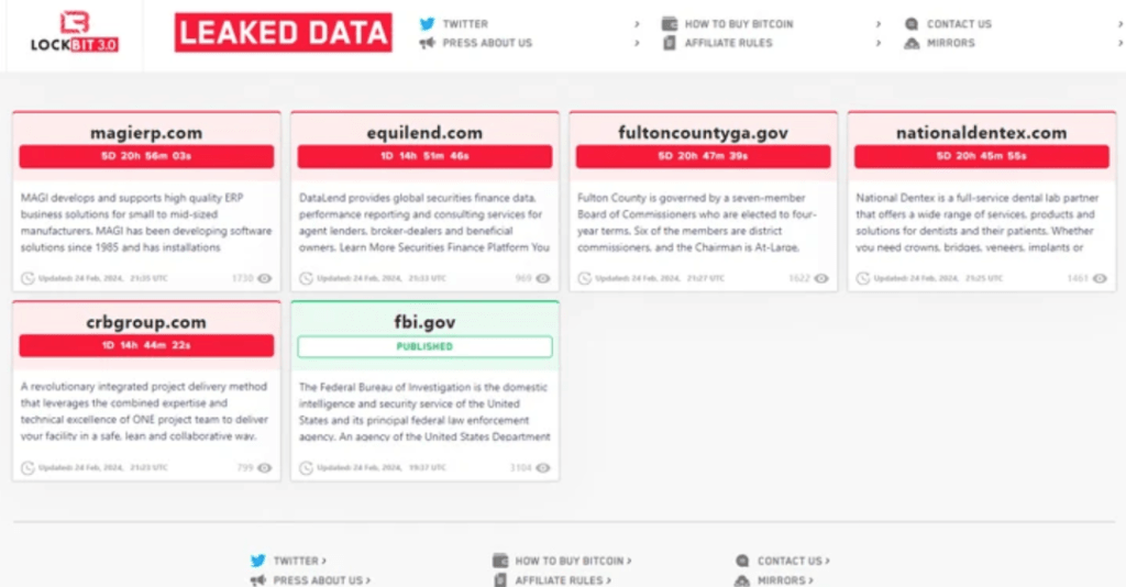 2024/02/24 TheHackerNews — 先日に、国際的な法執行機関が LockBit のサーバーの制御を押収した。しかしその数日後に、LockBit ランサムウェアの背後にいる脅威アクターは、新しいインフラを使用してダークウェブに再浮上したことが明らかになった。悪名高い LockBit は、データ漏洩ポータルを TOR ネットワーク上の新しい .onion アドレスに移し、現時点において 12社の被害者を新たにリストアップしている。