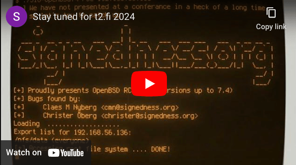 2024/03/25 SecurityOnline — OpenBSD や FreeBSD などの BSD 由来のオペレーティング・システムで使用されている NFS (Network File System) に、深刻な脆弱性 CVE-2024-29937 が存在することが判明した。この脆弱性の発見者である、signedness.org のセキュリティ研究者たち (Christer/Claes/Marcus) は、近々に開催される t2 Infosec Conference でプレゼンを行う予定だという。