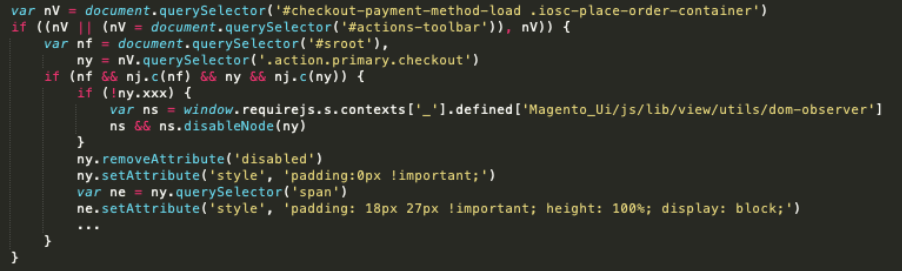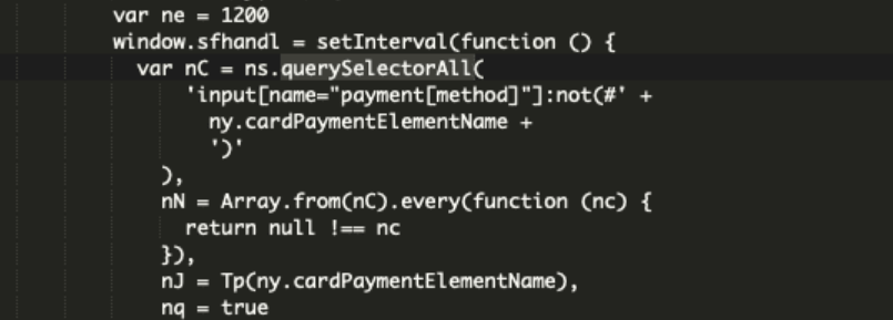 侵害された Web サイトのチェックアウト・ページへと移動すると、ページソースの奥深くに不審なスクリプトが埋め込まれているのが見つかった。このスクリプトは、base64 エンコードされた変数や、16進エンコードされた文字列などの、典型的なマルウェアの特徴を示していた。これらのスクリプトの要素を解読すると、クレジット カード情報を取得するように設計されていることが明らかになった。