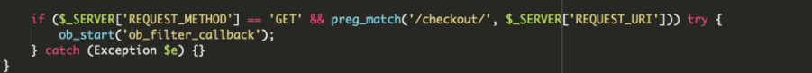 さらに調査を進めると、悪意のスクリプトから Magento の “app/bootstrap.php” ファイルへとたどり着いたが、このファイルは完全に置き換えられ、公式バージョンとは異なるものにされていた。base64 コンテンツをデコードすると、チェックアウト・ページのソースに見つかったものと同じの、悪意のスクリプトが発見された。この攻撃者は curl 関数を使用して、盗んだデータを外部ドメインへと流出させていた。また、キーワード “checkout” を含み、GET メソッドでリクエストされた Web ページに対しては、ob_filter_callback 関数によりスキマー・スクリプトを注入していた。