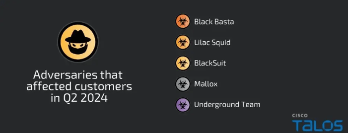 2024/07/28 SecurityOnline — Cisco Talos Incident Response (TalosIR) のレポートによると、2024年 Q2 はサイバー攻撃が急増し、ビジネス・メール侵害 (BEC:Business email compromise) とランサムウェアが主要な脅威として浮上している。この2種類の攻撃は、記録されたインシデント全体の 60%を占めている。BEC 攻撃の件数は、2024年 Q1 よりも減少してはいるが、依然として大きな脅威であることに変わりはない。その一方で、ランサムウェア攻撃は若干増加し、以前から知られている Black Basta や BlackSuit に加えて、Mallox や Underground Team が出現した。