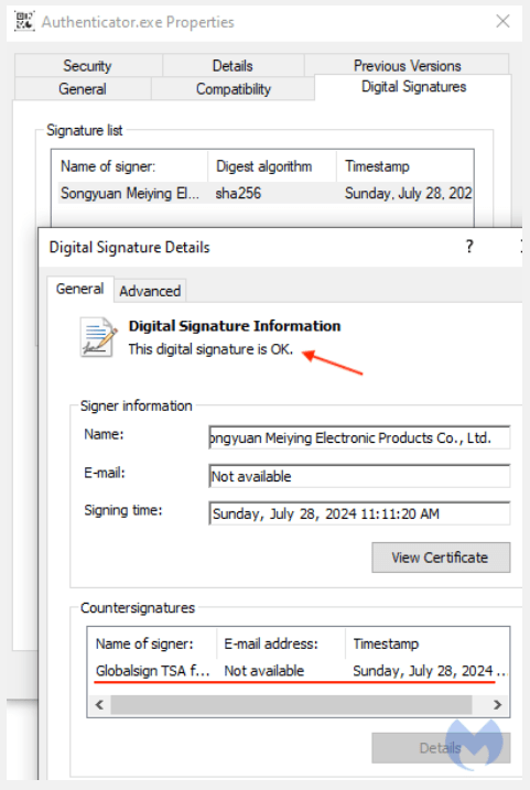 さらに調査を進めると、攻撃が発見される僅か1日前に実行ファイルは、Songyuan Meiying Electronic Products Co., Ltd によりデジタル署名されており、報告された時点においても署名が有効であったことが判明した。