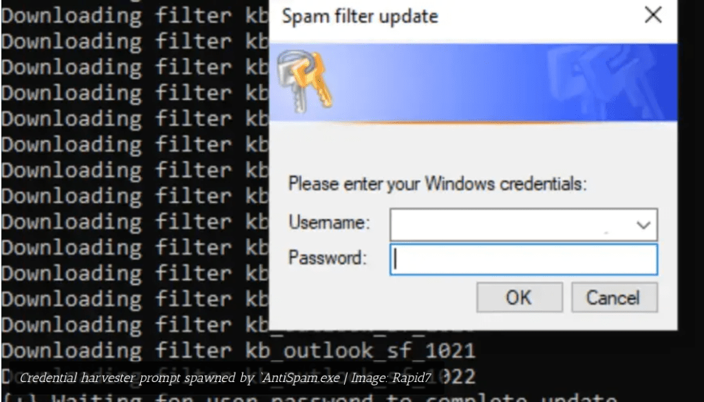 Rapid7 の調査で明らかになったのは、これまでの手法とは大きく異なる手法の存在である。攻撃者たちは、認証情報を採取するための従来からのスクリプトを、AntiSpam.exe という新たな 32-Bit の .NET 実行ファイルに置き換えているという。
