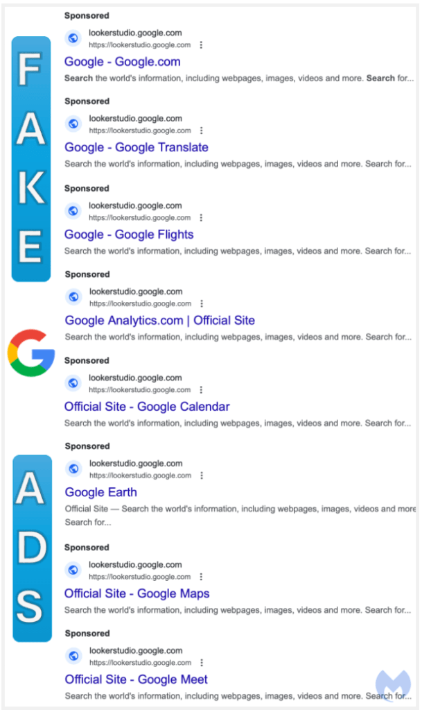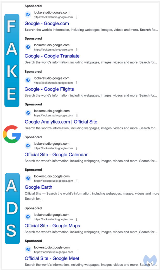 2024/08/16 SecurityOnline — Google 検索を利用する人々をターゲットにする巧妙なマルバタイジング・キャンペーンを、Malwarebytes Labs のサイバー・セキュリティ研究者が発見した。詐欺師たちは悪質な検索広告を介して、被害者を偽の Google ホームページへとリダイレクトするが、そこでは、Google の全製品ラインナップが大胆に偽装されている。