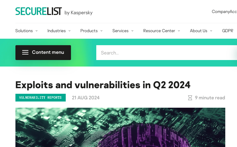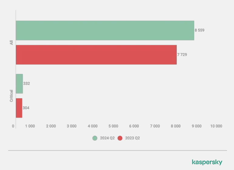 Kaspersky のレポートで強調されている懸念される傾向は、2024年 Q2 に登録された脆弱性の数が、昨年の同期の数値を上回り、年末までには 2023年の合計を上回る可能性が高いことである。この増加は、2019 年以降に観察された上昇傾向と一致しており、脆弱性が発見され悪用される可能性が、加速している状況を示唆している。