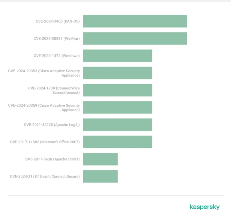 Kaspersky のテレメトリでは、Windows/Linux プラットフォームの両方を標的とする、エクスプロイト活動の増加が示されている。Windows の場合において、最も悪用されている脆弱性は、Microsoft Office スイート内の数式エディタや MSHTML といったコンポーネント内に存在している。たとえば、CVE-2018-0802/CVE-2021-40444 などの脆弱性含むエクスプロイトは、主にフィッシング・メールを通じて配信され、システムへのイニシャル・アクセスを役割としている。