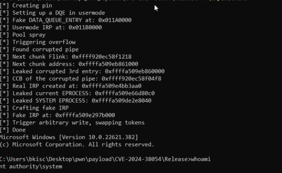 2024/08/22 SecurityOnline — 先日に修正された Windows の脆弱性 CVE-2024-38054 に対する、PoC エクスプロイト・コードがセキュリティ研究者の Frost によりリリースされ、悪用の懸念が高まっている。この深刻な脆弱性は、Kernel Streaming WOW Thunk Service Driver に存在するものであり、その悪用に成功したローカル攻撃者により、ヒープバッファ・オーバーフローが引き起こされ、システム・レベルへの権限昇格にいたる可能性がある。
