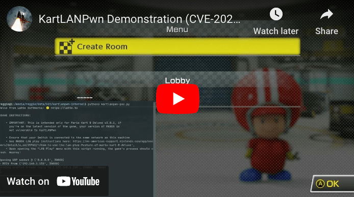 KartLANPwn と名付けられた脆弱性により、LAN マルチプレイヤーの “参照返信” プロセスにおいて、ゲーム・データを処理する際の、メモリ破壊の問題が悪用されることになる。攻撃者は、特殊なパケットを作成することで、ユーザーのコンソール上でコードを実行し、機密情報へのアクセスや、デバイスの完全な制御などを達成する。