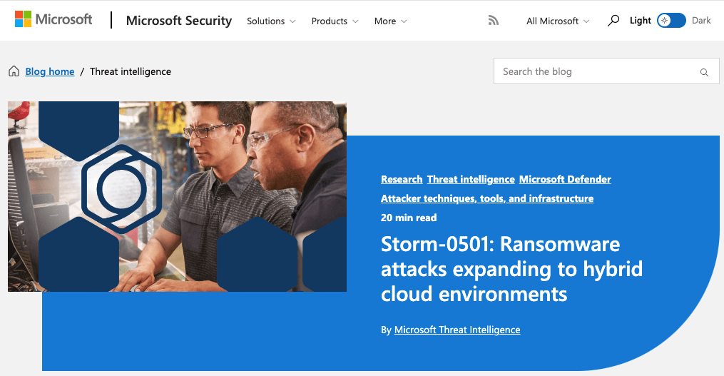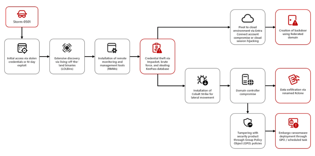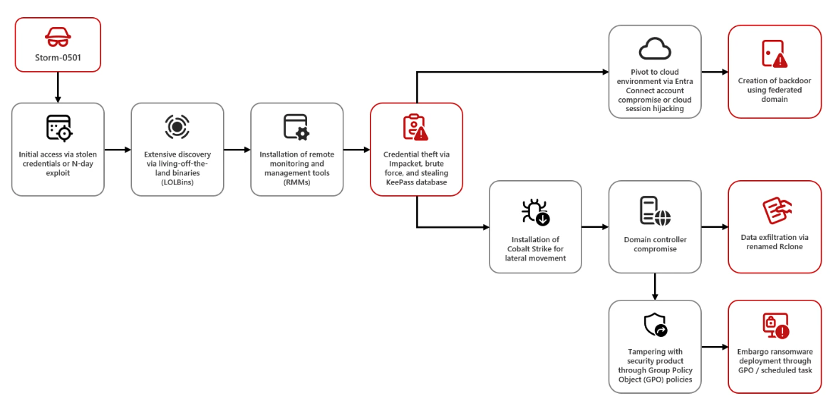 脅威アクター Storm-0501 は、少なくとも3年以上にわたって活動しており、Hive/BlackHat/LockBit/Hunters International といった犯罪グループが提供するランサムウェアを、ターゲットに仕掛けてきた。さらに、最近では、Embargo ランサムウェアのドロップも開始している。