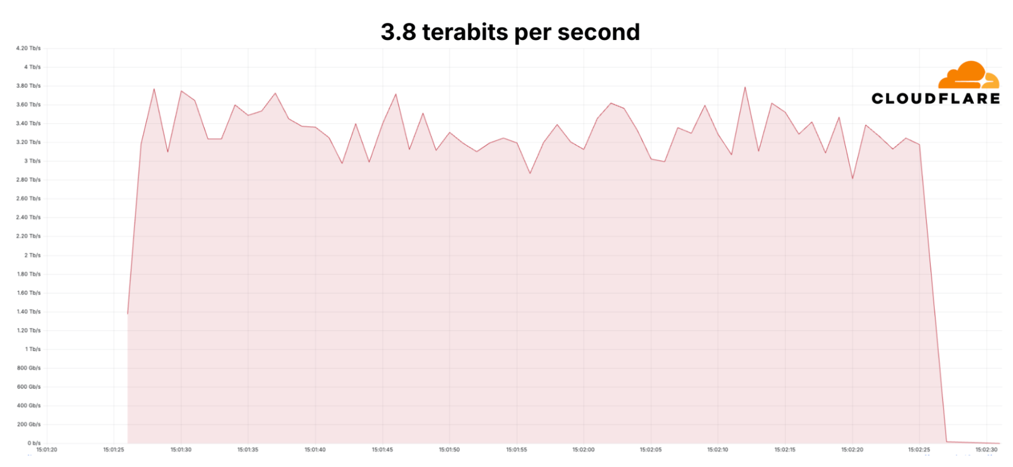 Cloudflare は、「当社の防御システムは1ヶ月間において、100件以上のハイパー・ボリメトリック L3/4 DDoS 攻撃を緩和した。その多くは、1秒あたり 20億 Bpps/3 Tbps を超えていた。最大の攻撃は 3.8 Tbps に達し、これまで公表された中で最大の規模であった。検知と緩和は完全に自立的に行われた」と述べている。