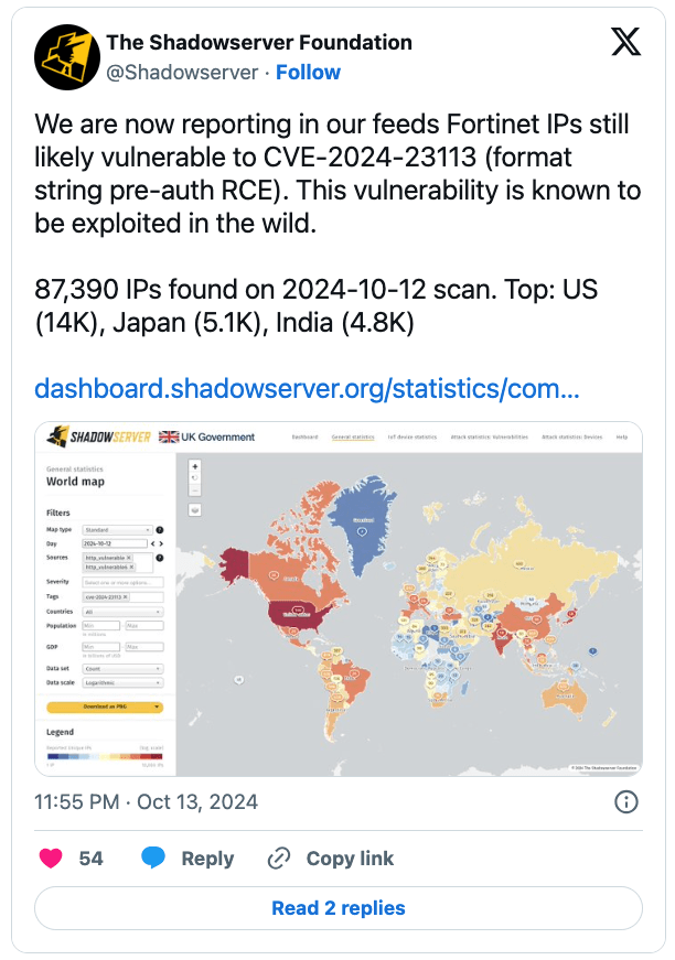 2024/10/13 SecurityOnline — 最近の Shadowserver Foundation レポートによると、数ヶ月前にパッチが提供された RCE の欠陥 CVE-2024-23113 に対して、Fortinet デバイスの多くが脆弱な状態にあり、現在も悪用されているという。