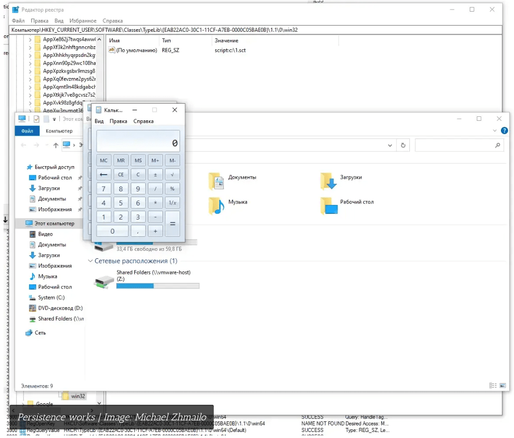そして Zhmailo が発見したのは、”explorer.exe” が LoadTypeLib() 関数を呼び出し、モニカに必要なレジストリ キーをハイジャックすると、そのモニカが explorer.exe 内でインスタンス化され、そのコードが実行されるというチェーンである。
