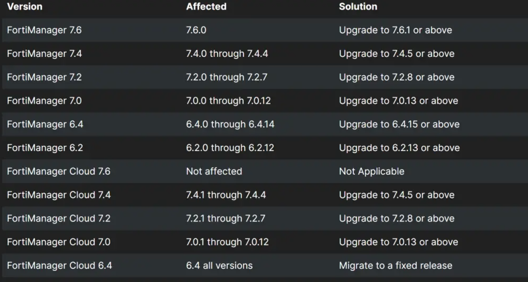 この脆弱性が影響を及ぼす対象は、FortiManager 7.x/6.x、FortiManager Cloud 7.x/6.x などの各バージョンと、特定のコンフィグレーションを持つ古い FortiAnalyzer モデルである。