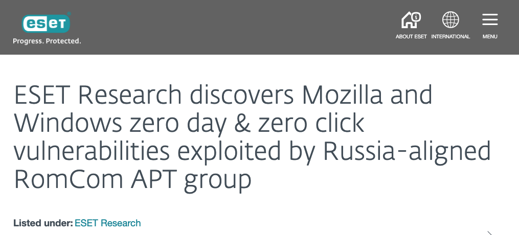 2024/11/26 SecurityOnline — ロシア由来の脅威アクター RomCom による、Mozilla Firefox/Microsoft Windows のゼロデイ脆弱性を悪用する協調攻撃が、最近の ESET サイバー・セキュリテ・レポートで明らかにされた。これらの脆弱性は未知のものであるが、実際に悪用されているという。ユーザーの介入を必要とせずに、攻撃者による悪意のコード実行が可能になるという、高度な技術が検証されている。