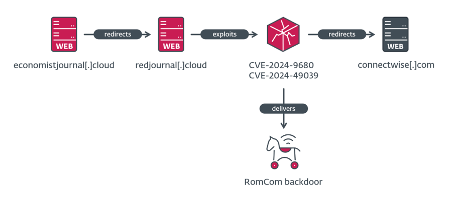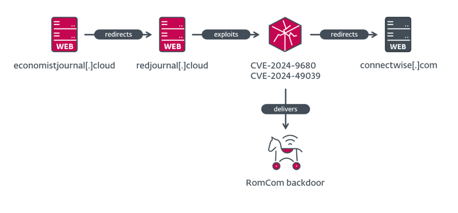 RomCom (Storm-0978/Tropical Scorpius) は、サイバー犯罪とスパイ活動を並行させることで知られている。このキャンペーンにおいて、RomCom はエクスプロイトを悪用し、コマンドを実行することで、RomCom バックドアを配信し、それにより、追加の悪意のペイロードをダウンロードしていた。この、一連のアクションが、ESET のテレメトリにより検出され、標的が広範囲に散在していることが判明したが、その大半は欧州と北米にいるという。