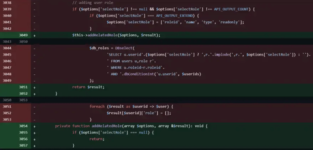 この脆弱性は Zabbix のフロントエンドに存在し、具体的には CUser クラスの addRelatedObjects 関数に関連している。この関数は CUser.get メソッドにより呼び出される。Zabbix プロジェクトの説明によると、この欠陥により、デフォルトのユーザーロールまたは API アクセスを許可する、任意のロールを持つ非管理者ユーザー・アカウントから、この脆弱性の悪用が可能になるという。