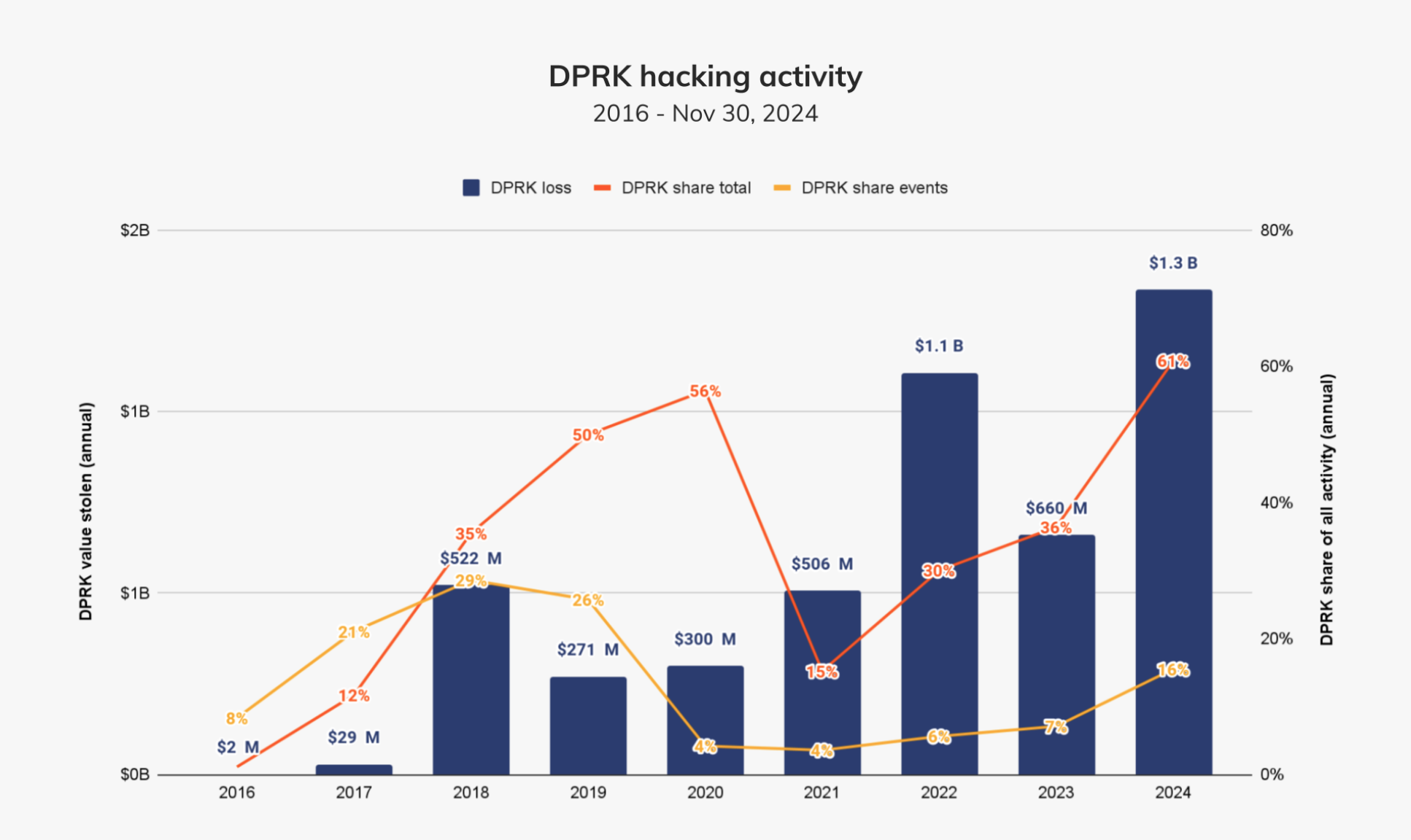 これは、年間を通じて盗まれた、すべての暗号通貨インシデントによる総額の 61% に相当する。この何年かにおいて、北朝鮮のグループは膨大な量の暗号通貨を窃取しており、平壌政権に収入をもたらしている。