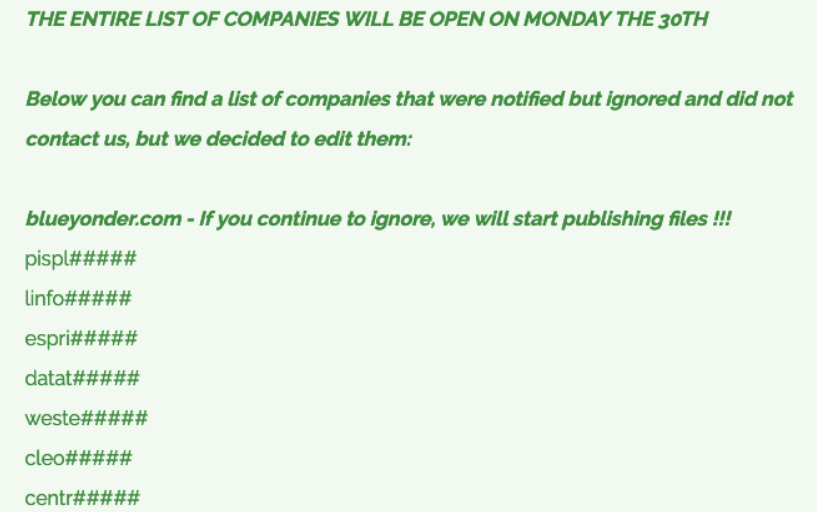 この Cl0p による最新の投稿は、サイバー犯罪者からの連絡を、Blue Yonder が無視していることを示唆する。