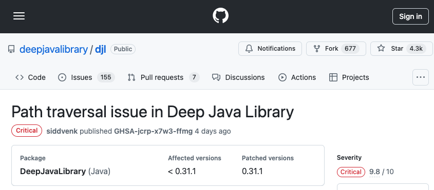 Deep Java Library のパス・トラバーサルの脆弱性が FIX しました。ご利用のチームは、ご注意ください。なお、関連するトピックは、2024/06/17 の「Deep Java Library の深刻な脆弱性 CVE-2024-37902 が FIX:システム乗っ取りの恐れ」となります。よろしければ、カテゴリ AI/ML と併せて、ご参照ください。