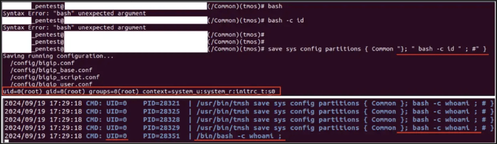 さらに懸念されるのは、F5 の制限された Traffic Management Shell (tmsh) 内での悪用の手口である。通常において、管理者以外のロール を持つユーザーは、実行できるコマンドを制限されている。しかし、攻撃者は tmsh コマンド解析を用いてバイパスを発見できる。