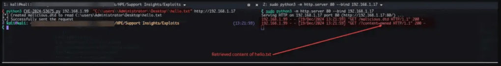 Robin の CVE-2024-53675 の PoC エクスプロイトは、悪意の DTD ファイルをホストすることでペイロードを送信し、指定されたファイルのコンテンツを取得してリスナーとの間での送受信を実証するものだ。ただし、このエクスプロイトは、改行文字の解析の問題により、ファイルの先頭行だけ送信するというライブラリの制約により、データを盗み出す能力が制限される。