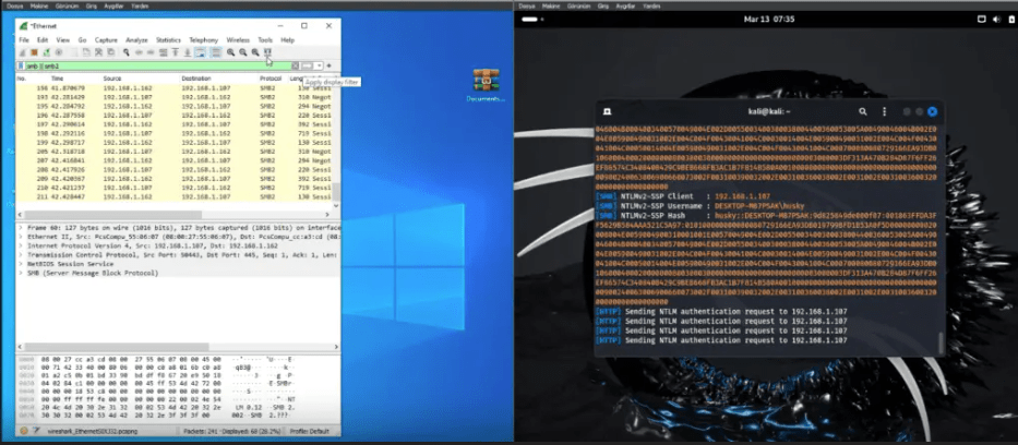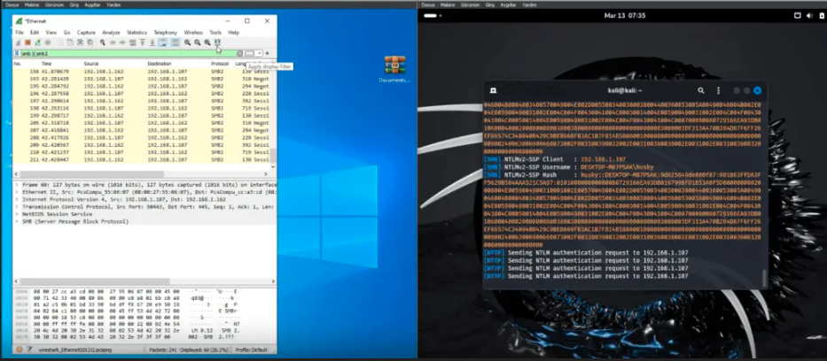 Wireshark のキャプチャでは、悪意の “.library-ms” ファイルが抽出されると、SMB 通信が試行される様子が示されている。このキャプチャにより、SMB2 ネゴシエート・プロトコル・リクエストと、SMB2 セッション・セットアップ・リクエスト (NTLMSSP_AUTH) の試行が明らかになった。つまり、NTLM 認証ハンドシェイクの開始が明確に示され、Windows がファイルを抽出したときに、SMB サーバで自動的に認証を試行することが証明されている。